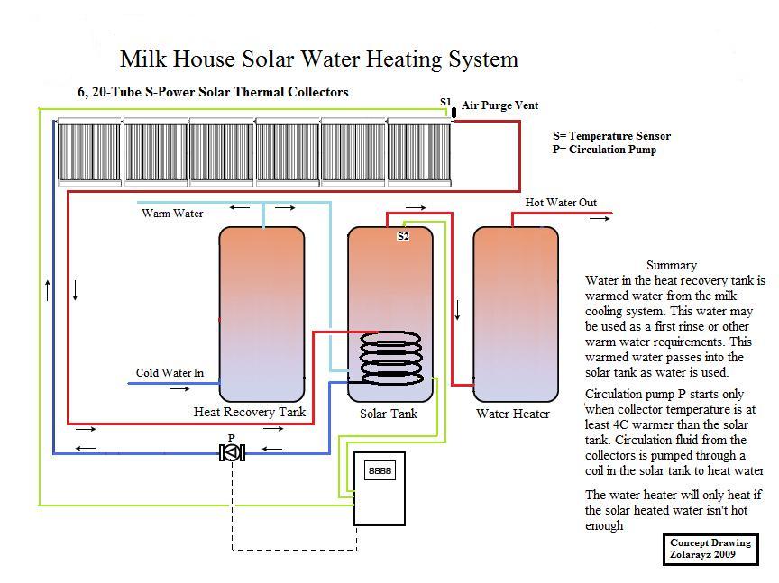 From greenhouses to workshops to dairy barns, solar thermal systems are able to reduce heating costs on the farm. Integrating a solar water heating system into an existing system is not difficult. The illustration below shows how a solar water heating system can be tied into an existing milk house.